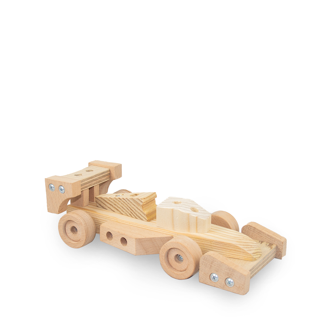Ahşap Oyuncak Yarış Arabası; 17 parçadan oluşan bu güçlü yarış arabası pistlere çıkmak için çocukların analitik becerilerine ve motor kas becerilerine güveniyor.