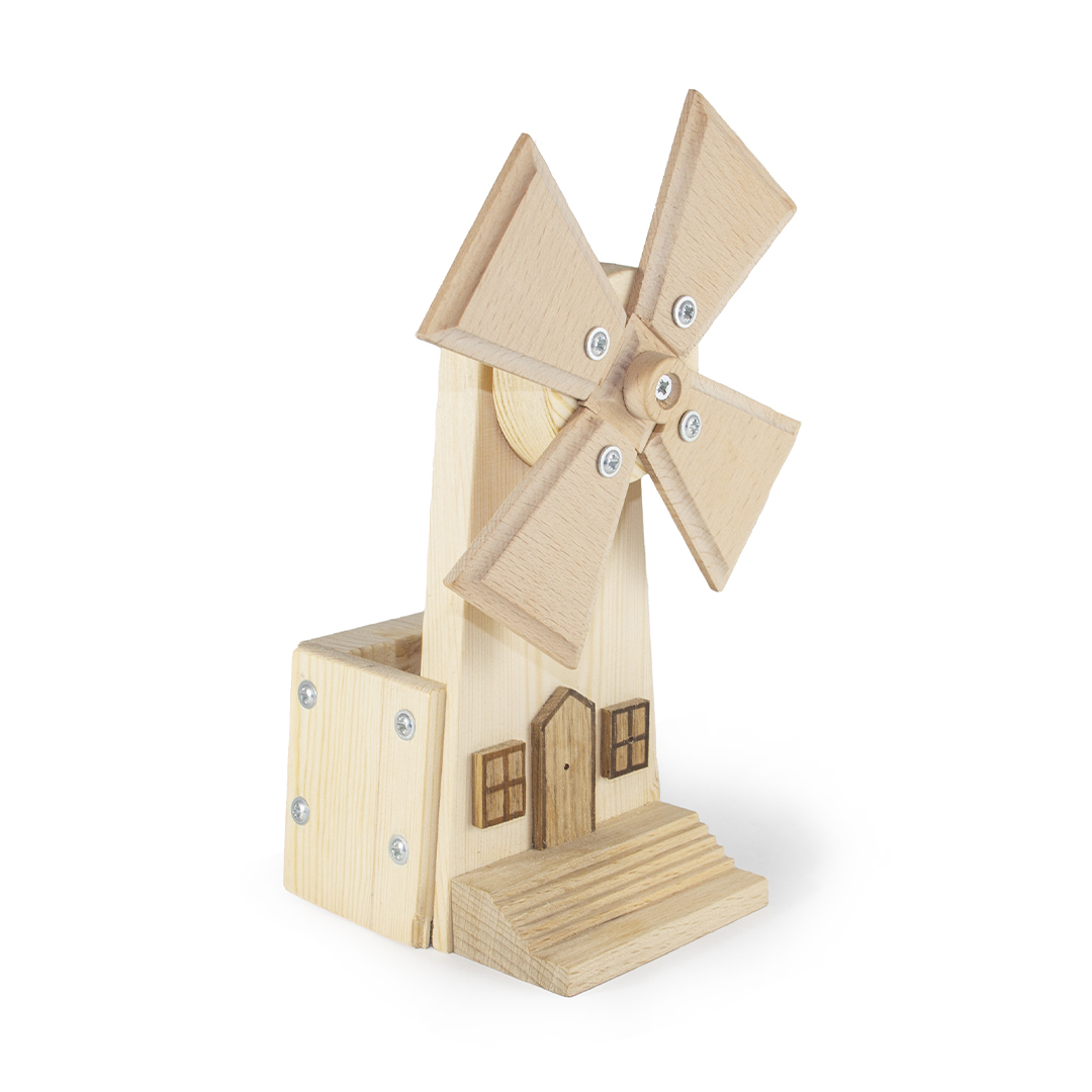 Ahşap Yel Değirmeni Kalemlik; 14 parçadan oluşan bu Ahşap Yel Değirmeni un elemeye başlamak için rüzgarı ve sizin parçaları birleştirmenizi bekliyor.